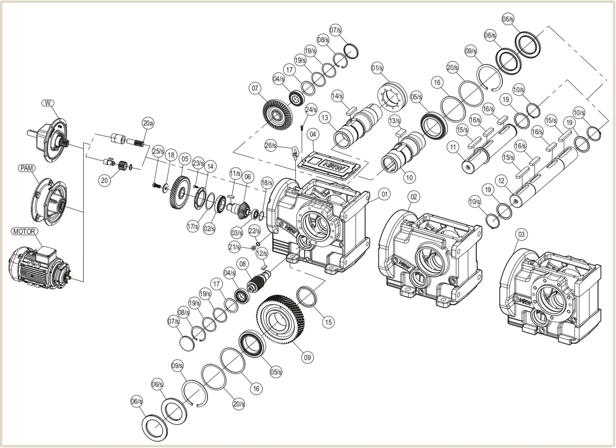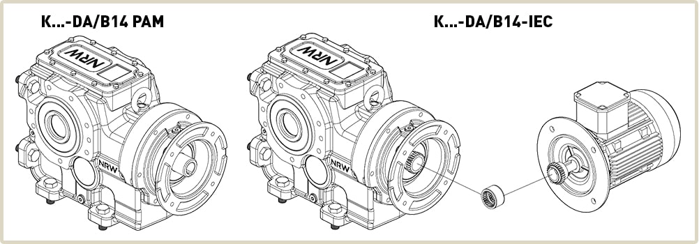 Трехступенчатые коническо-цилиндрические мотор-редукторы К производятся немецкой компанией NRW на турецком заводе PGR. Являются альтернативой европейских брендов Nord, Motovario, Sew-Eurodrive, широкий ряд передаточных чисел и выходной частоты вращения полностью перекрывают потребность в двухступенчатых и частично одноступенчатых моделях. Ниже на чертеже устройство коническо-цилиндрического мотор-редуктора серии К.
