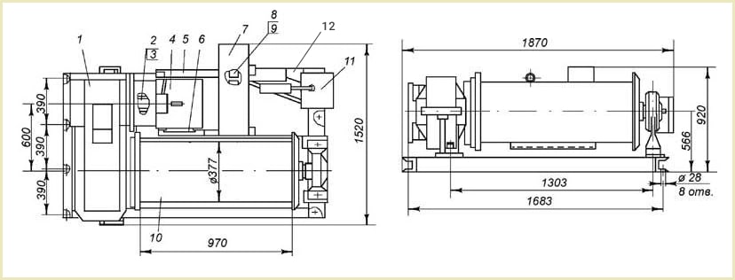 | ТЛ-7Б-1 | 4500 | 0,36 | 250 | 22,5 | Ц2У-400-50 | 15 | ТКГ-300 | 1870x1520x920 | 1580 |