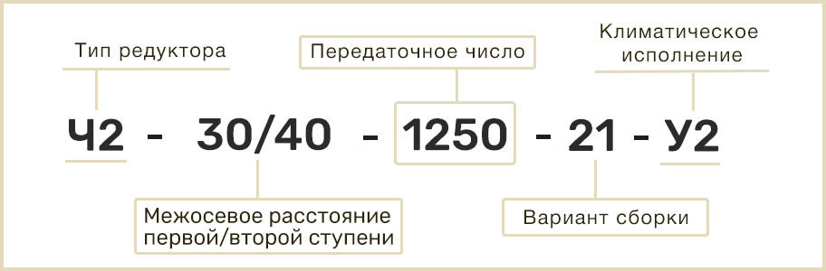 Условное обозначение полного названия модели содержит информацию о передаточном числе, варианте сборки, межосевом расстоянии и климатическом исполнении.