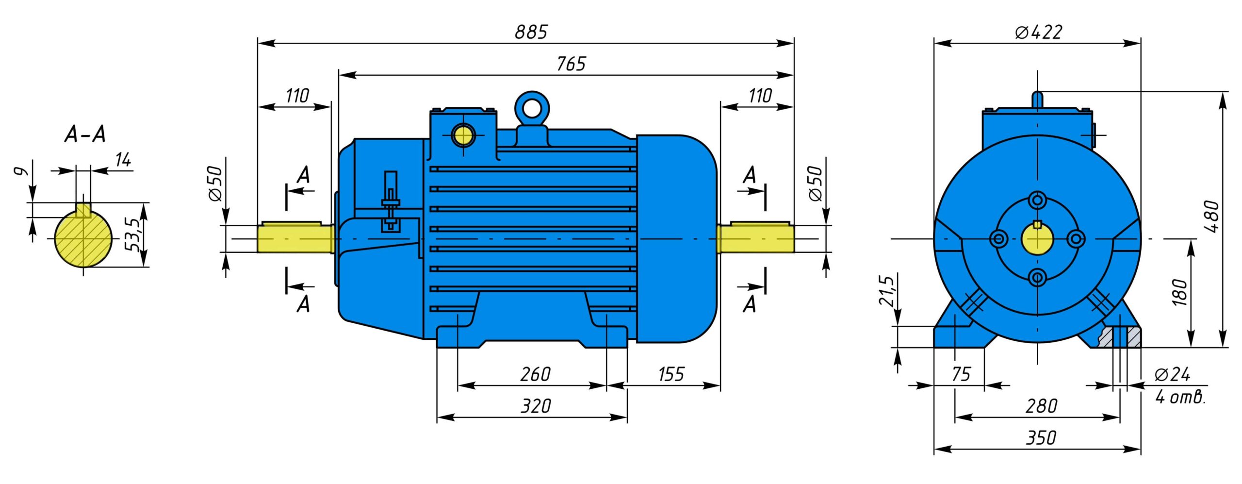 | N, об/хв | Р, кВт | U, В | Розміри вала, мм | КПД, % | Соs ф | I номінальний, А | Ковзання, % | Клас захисту | Маса, кг | |||