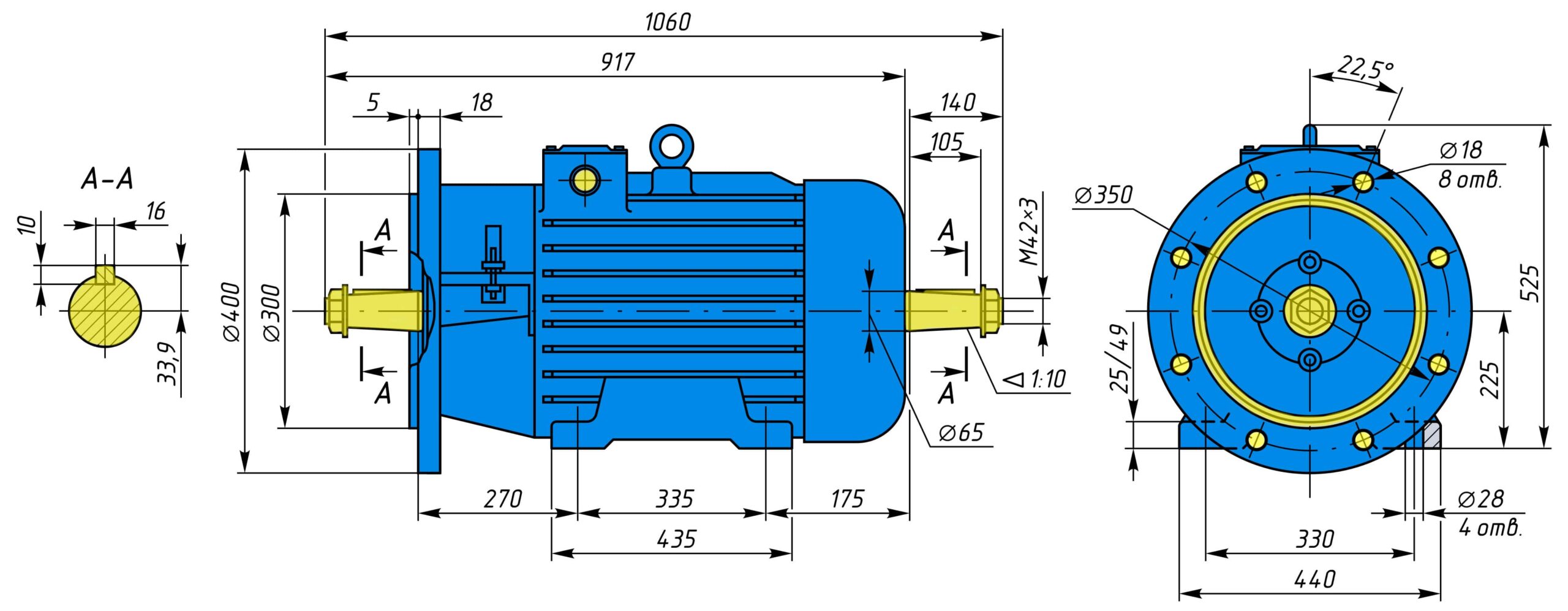 На кресленнях відображені габаритні, приєднувальні та установчі розміри електродвигуна MTH 411-6 22 кВт 960 оборотів у фланцевому виконанні та на лапах виробництва Сибелектромотор. Для перегляду креслення – натисніть на зображення.